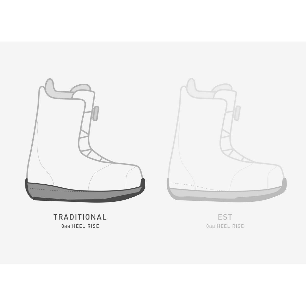 Traditional midsole ramp angle sets the user΄s heel above their toes when inside their boots, putting the rider on the balls of their feet in an athletic ready position, mimicking the ramped position found in athletic performance footwear.