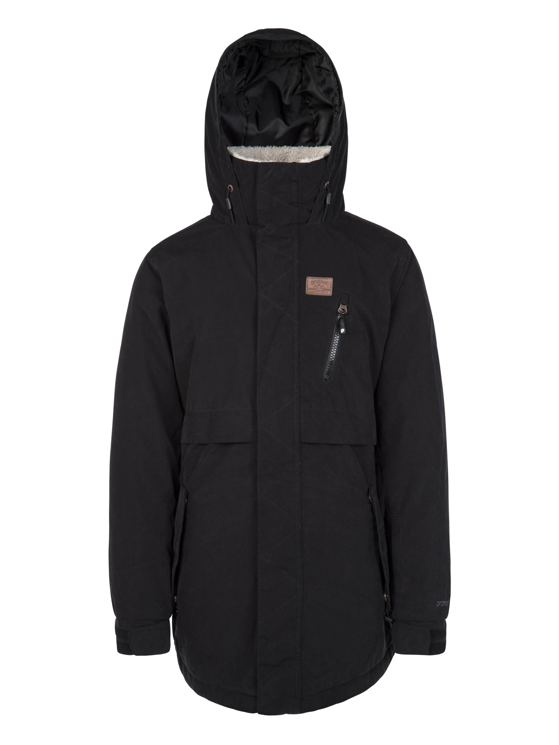 Introducing the streetwise Lanza JR by Protest. This gorgeous ski jacket / snowboard jacket is part of our Geotech series; functional clothing that will help you get there. Featuring 10K water resistance, moisture is dispersed away from the inside of the jacket while the outside of the jacket is waterproof and windproof. The fabric of this jacket has a suede-like look and feel. Inspired by the parka jacket, the Lanza JR has a longer length and some fabulous detailing. The high collar is lined with a soft and warm teddy fur. The chest and side pockets are zippered. Perfect for your next winter adventure, the Lanza JR by Protest. This model is 1.52m and wears size 152.