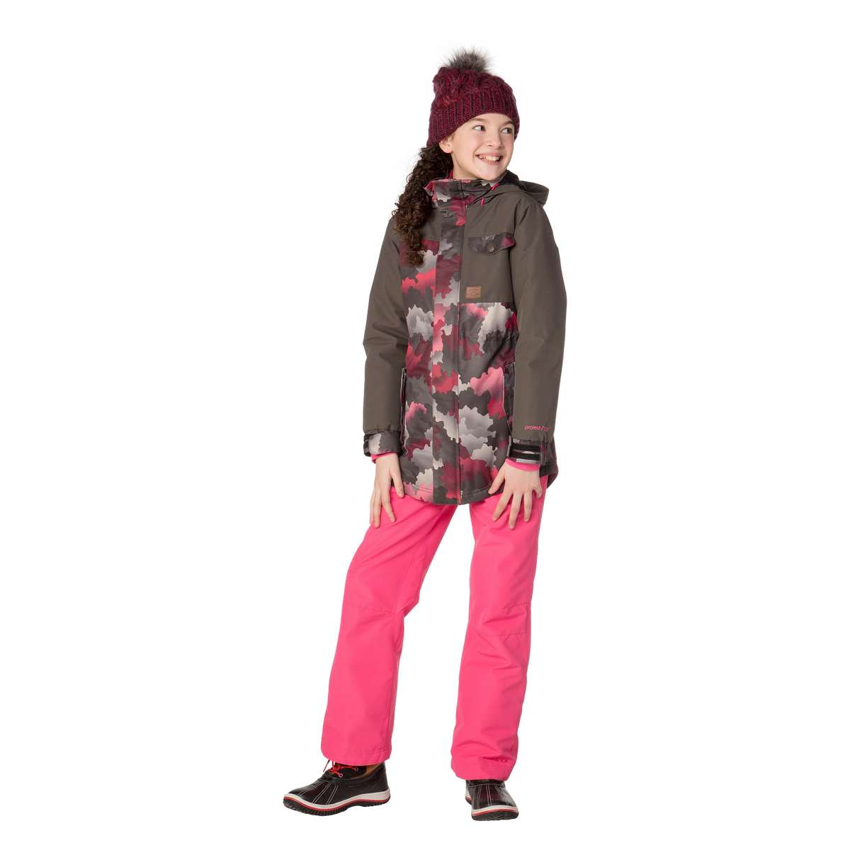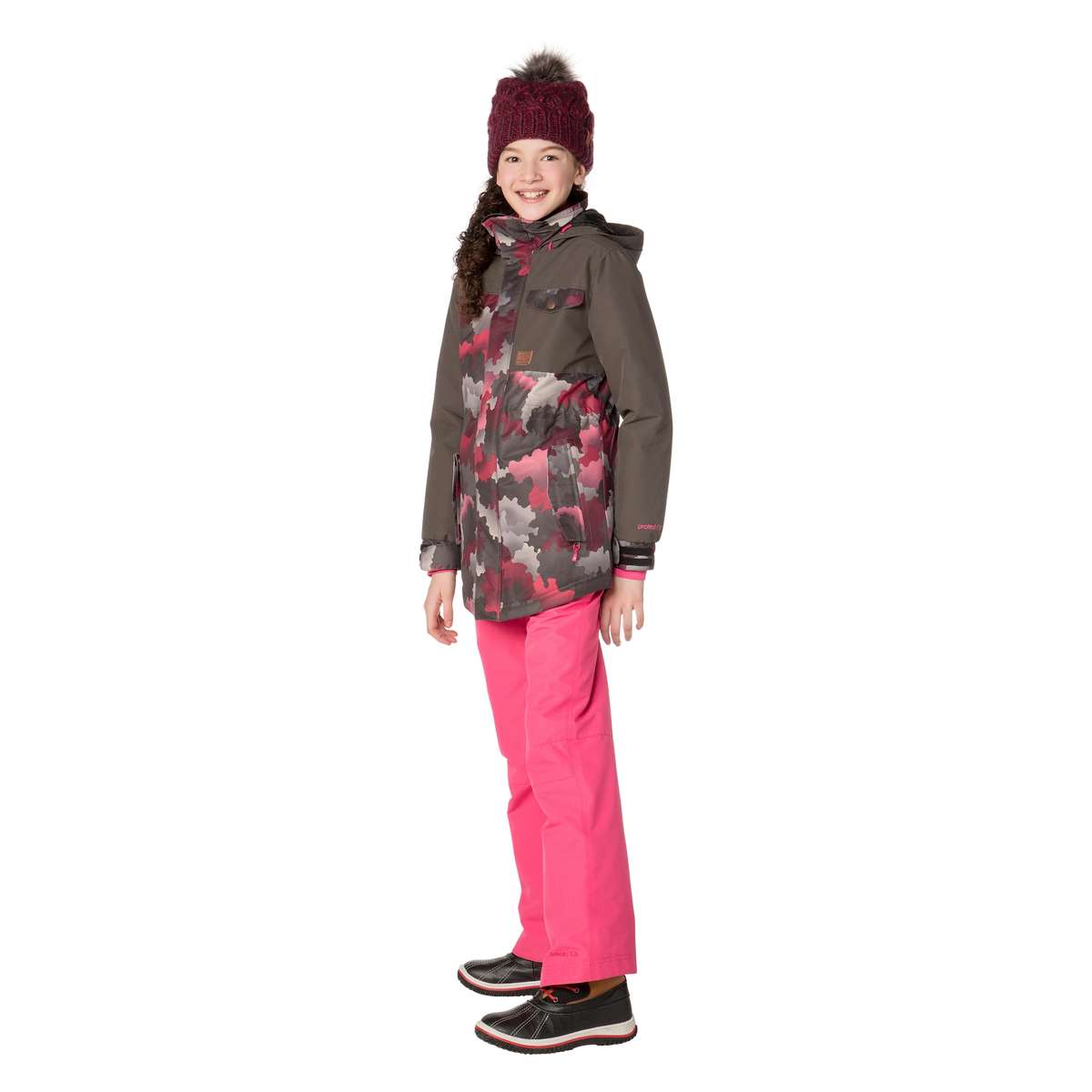 Introducing the fabulous Romijn JR by Protest. This tremendous longer length ski jacket / snowboard jacket brings some serious street style to the slopes. The Romijn JR is part of our Geotech series; functional clothing that will help you get there. Featuring 10K water resistance, moisture is dispersed away from the inside of the jacket while the outside of the jacket is waterproof and windproof. The body, high collar and cuffs feature an awesome camouflage print. The side pockets are zippered and there’s a lift pass pocket under the arm. Perfect for your next winter adventure, the Romijn JR by Protest. This model is 1.52m and wears size 152.
