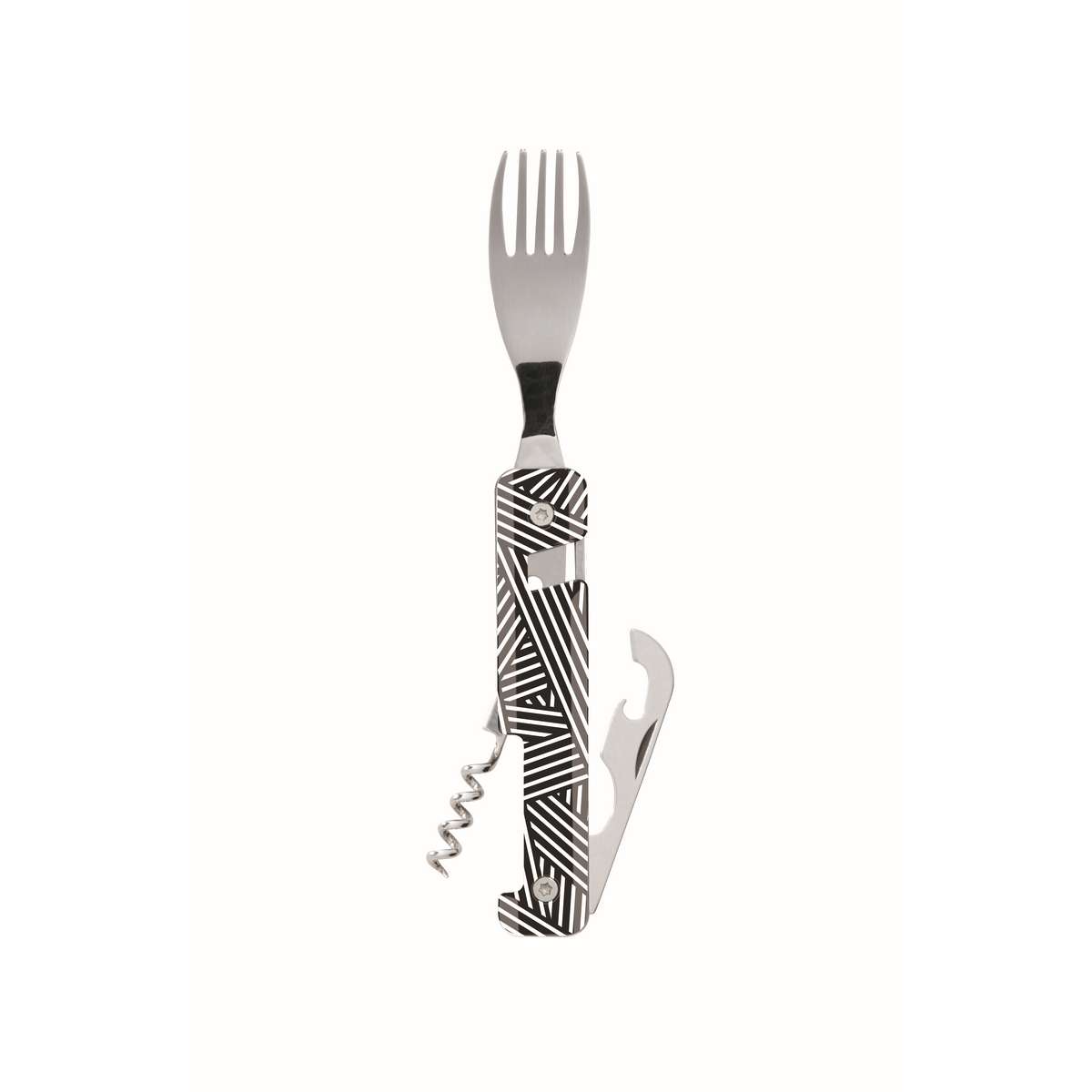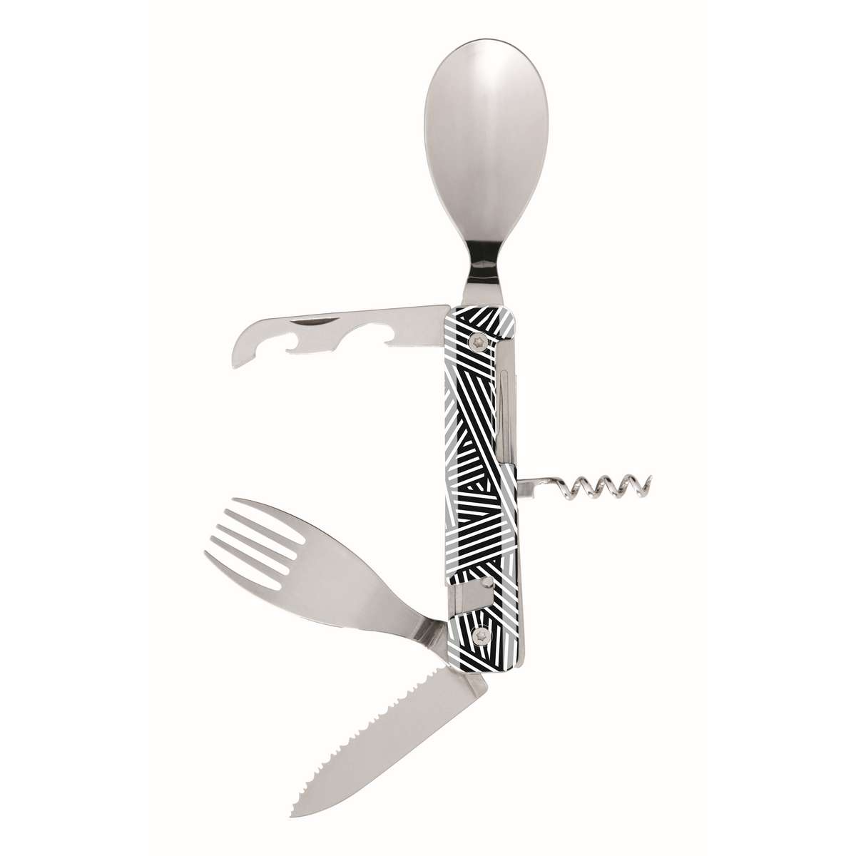 Multifunctional everyday companion: your new 13H25 cutlery set can do anything. This multifunctional folding cutlery features a large spoon, a 5-tooth fork, a knife with a micro-serrated blade... and more! It also features a 4 spiral corkscrew, a can opener and a bottle opener. Easy to fix with built-in magnet. Compact design so you can take the outdoor cutlery anywhere.