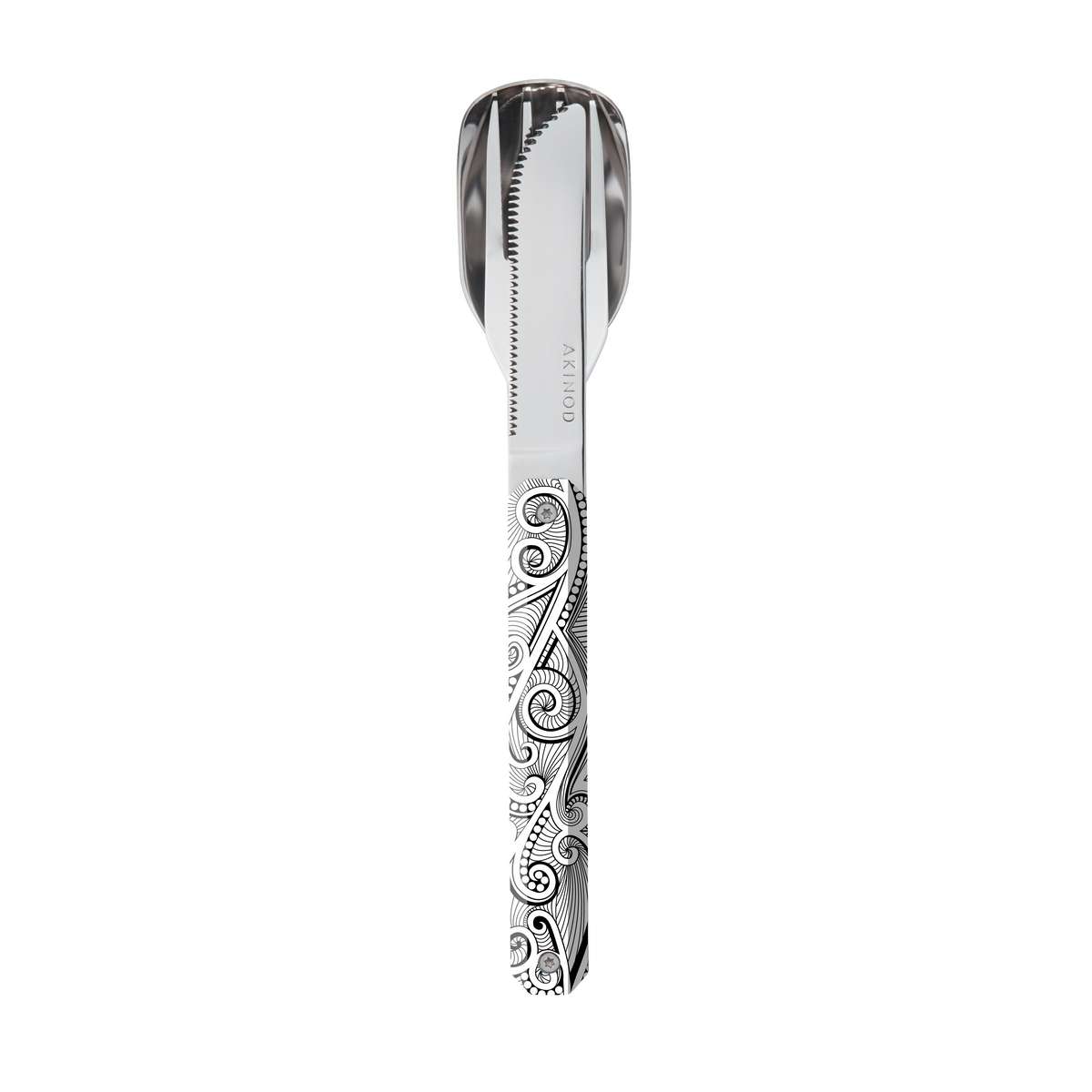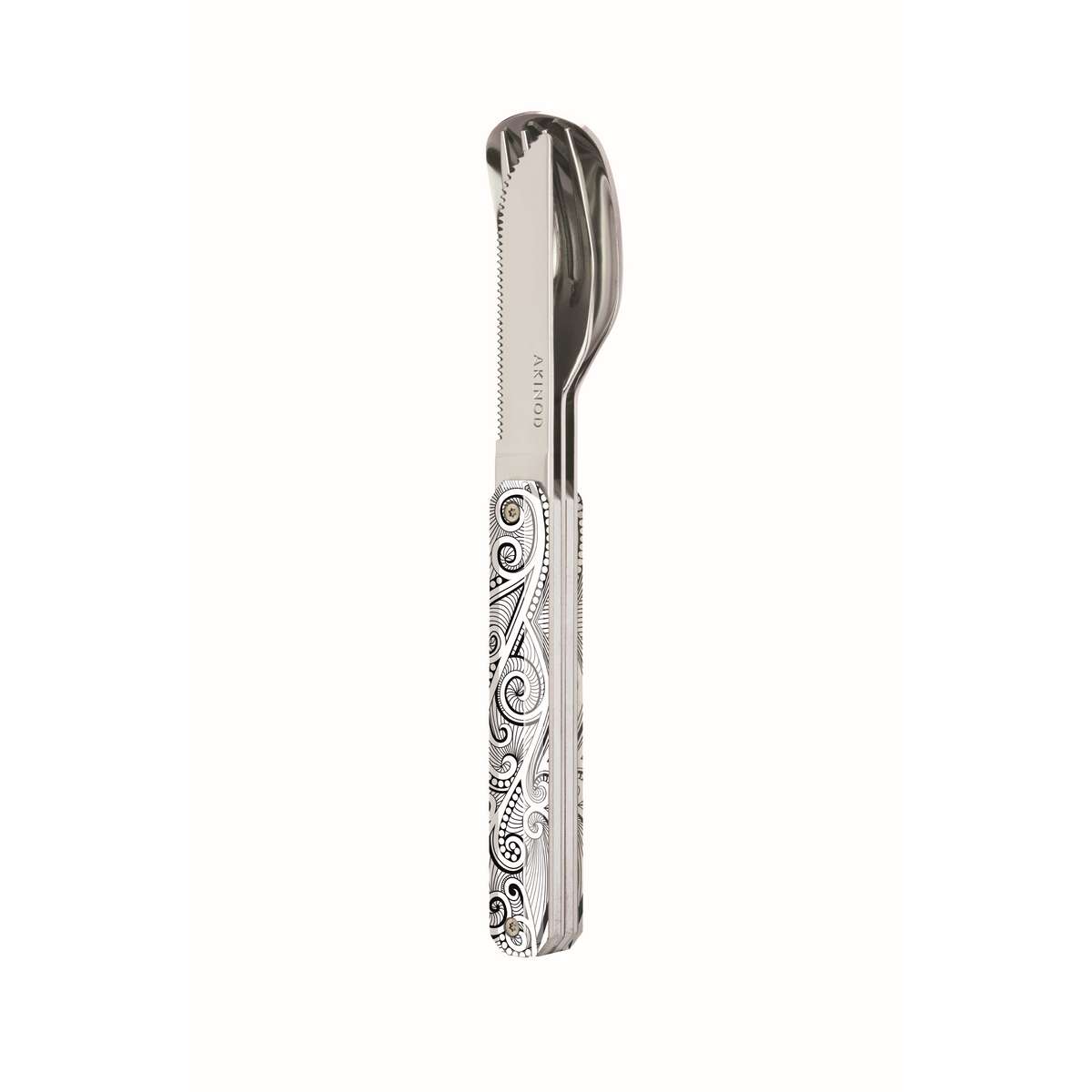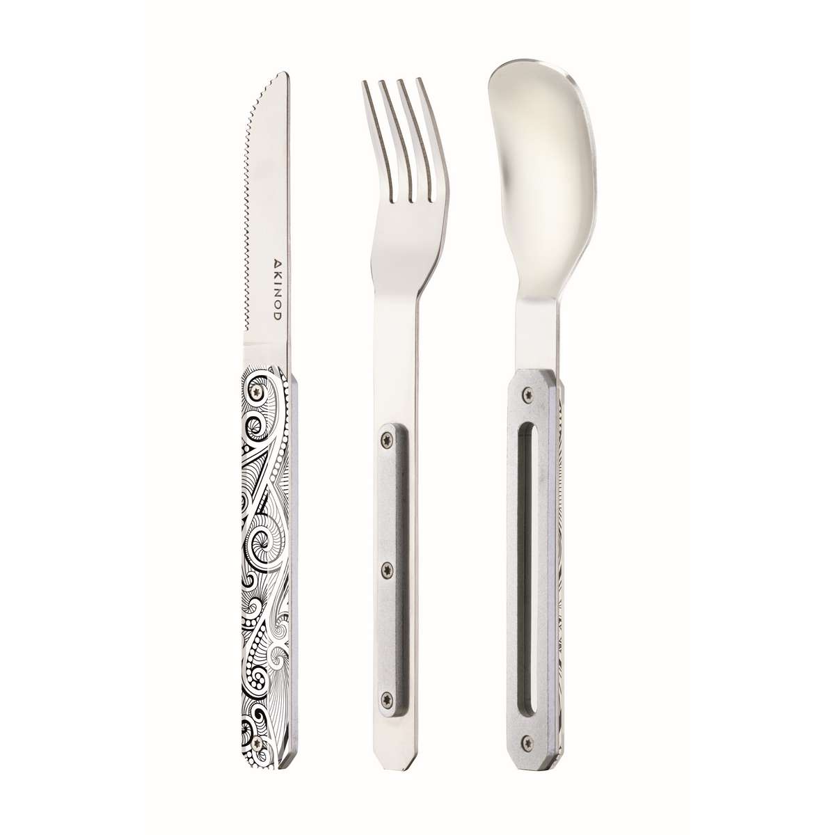 Cutlery in martensitic stainless steel 2CR14, polished mirror finish. Comprises a large spoon, a 4-pronged fork and a knife with a micro-serrated blade. Decorated transparent polymer handle. Magnetic assembly.