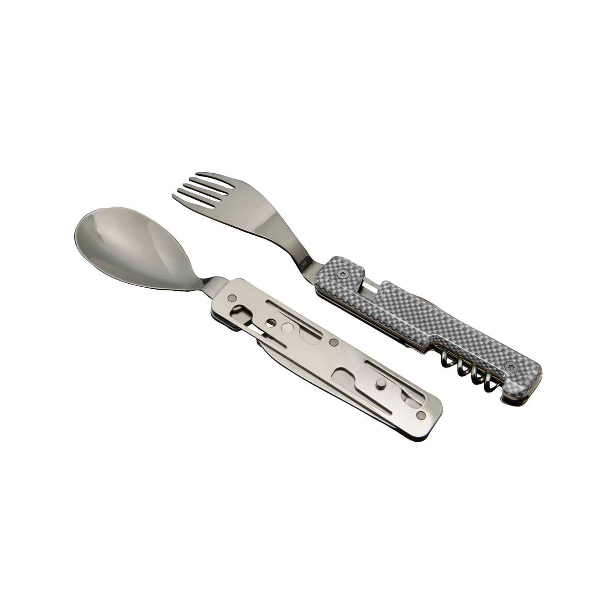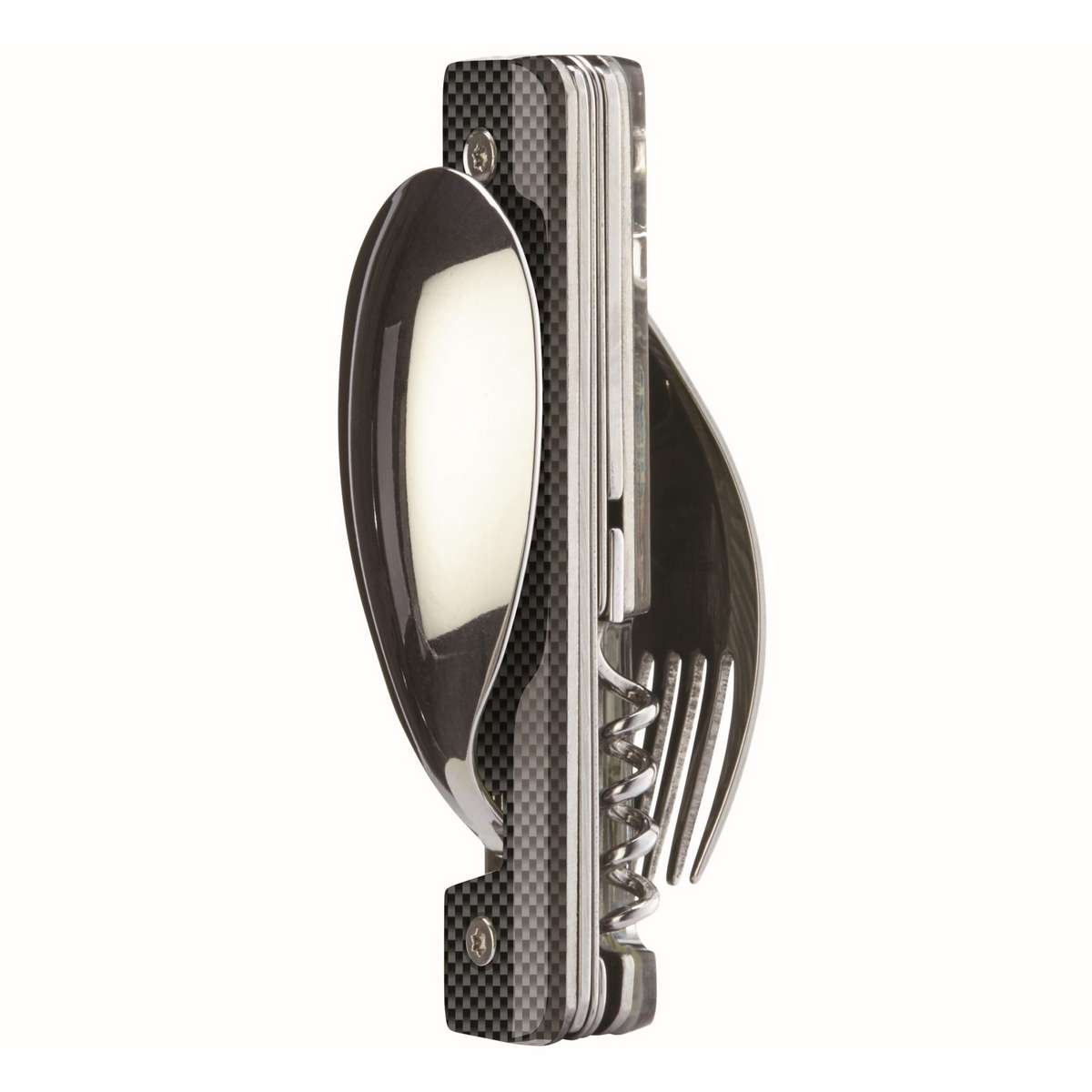 Multifunction cutlery in stainless steel 2CR14, polished mirror finish. Comprises a large spoon, a 5-pronged fork, a knife with a micro-serrated blade, a 4-spiral corkscrew, a can-opener and a bottle opener. Decorated transparent polymer handle. Magnetic assembly.