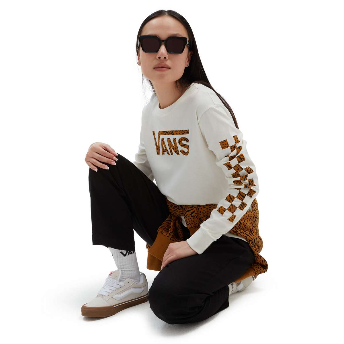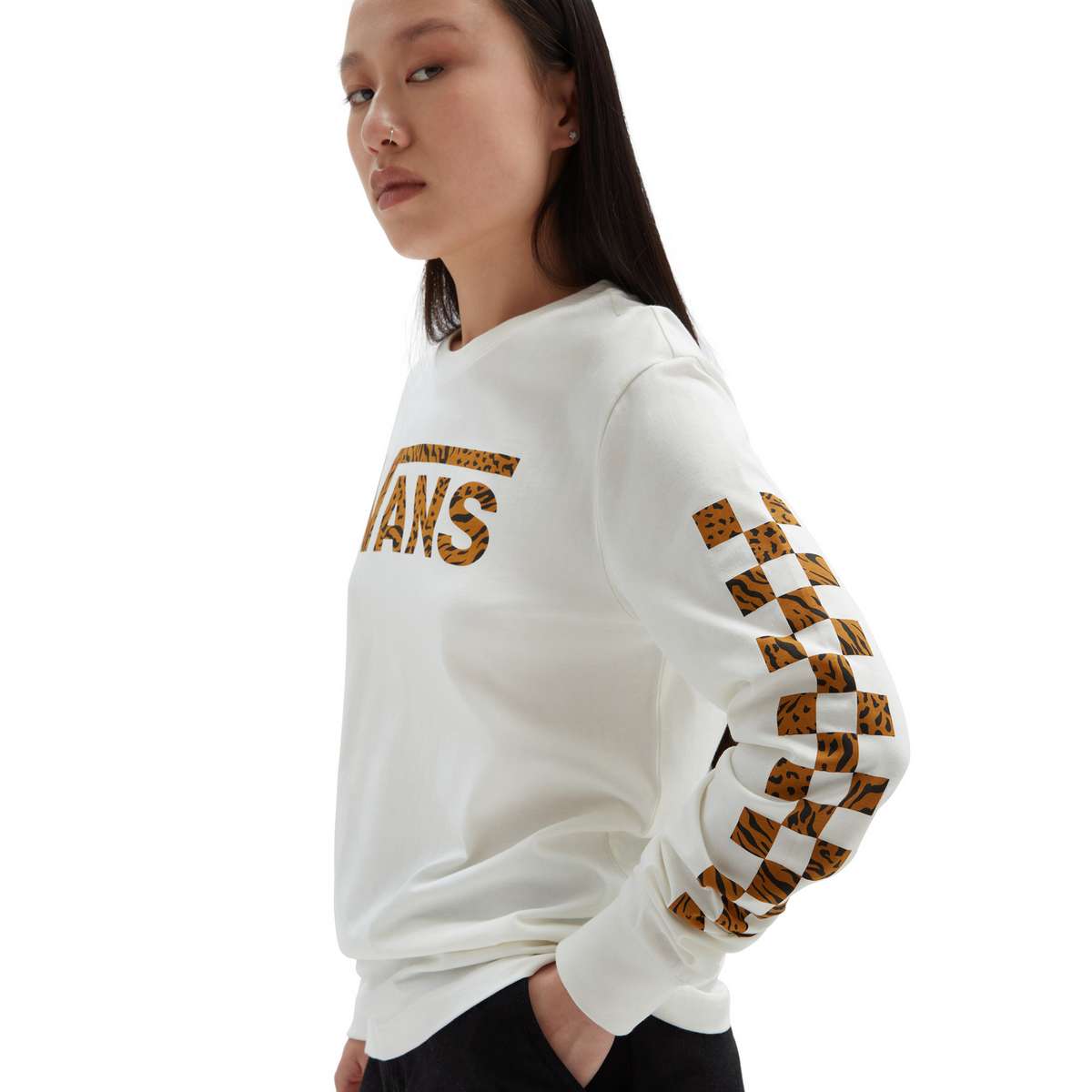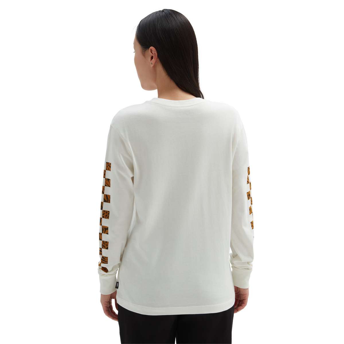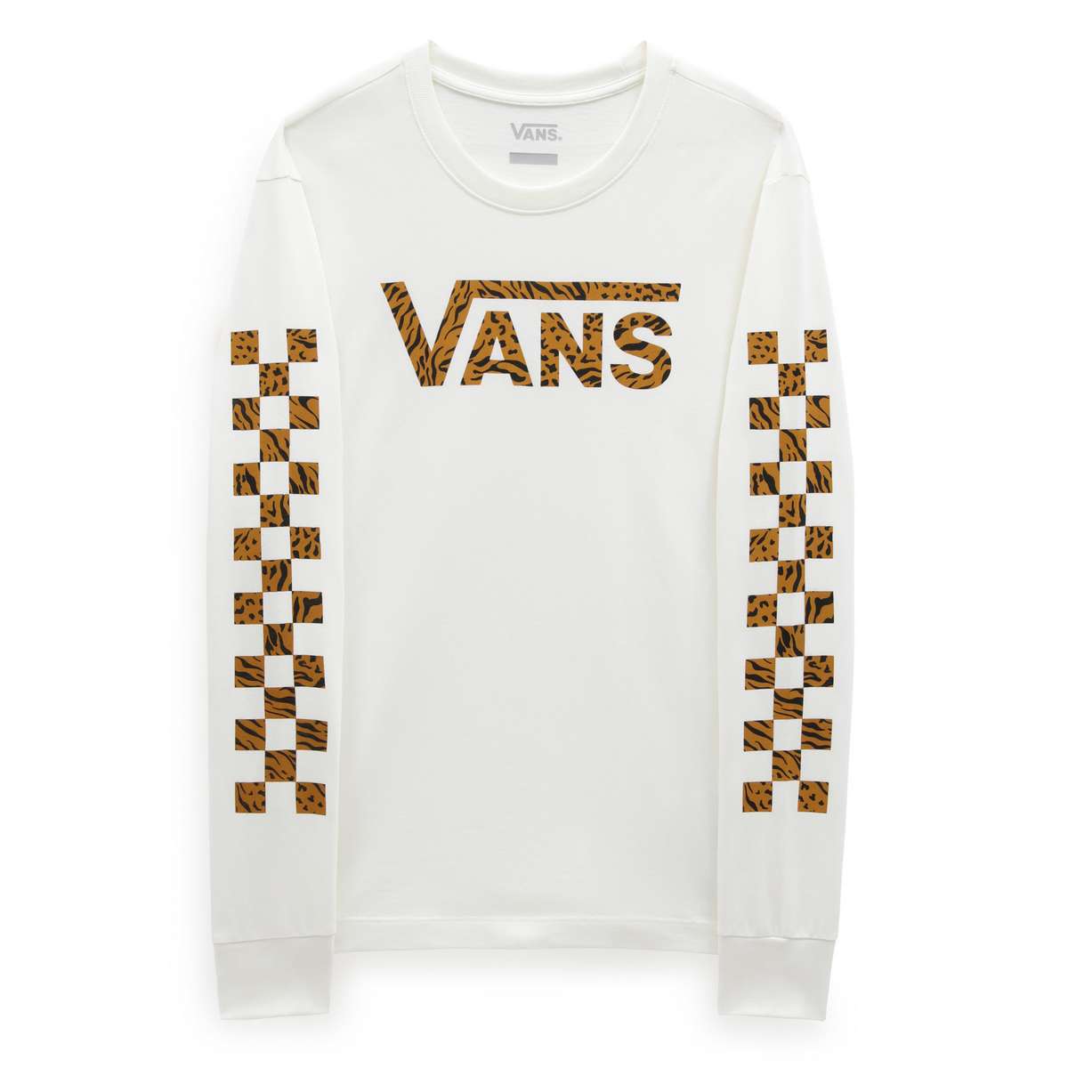 The Vans Animash Long Sleeve Boyfriend Fit T-Shirt has a crew neck and features a checkerboard print down both sleeves. The Vans logo is on the front and the t-shirt features an animal print on the logo and sleeves.