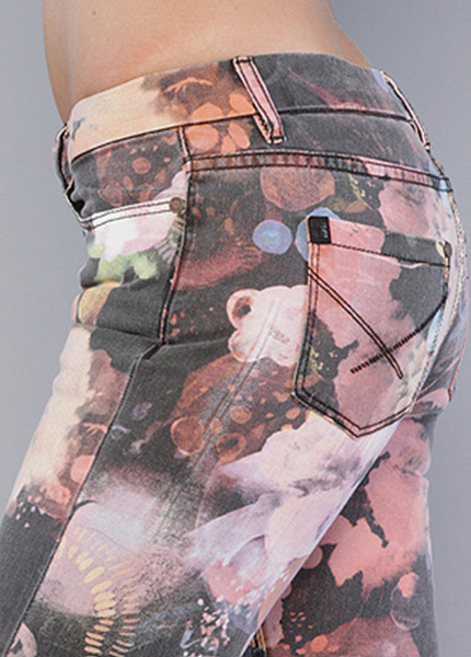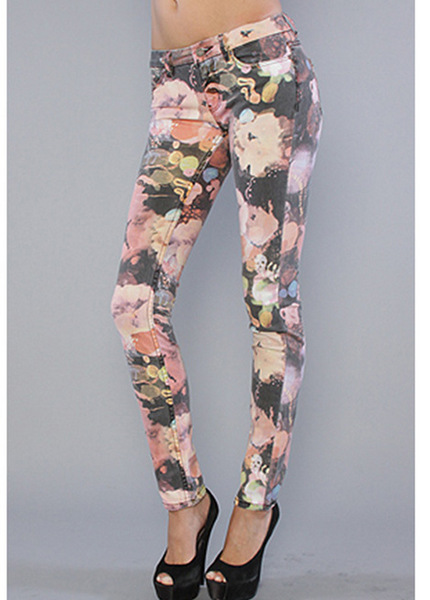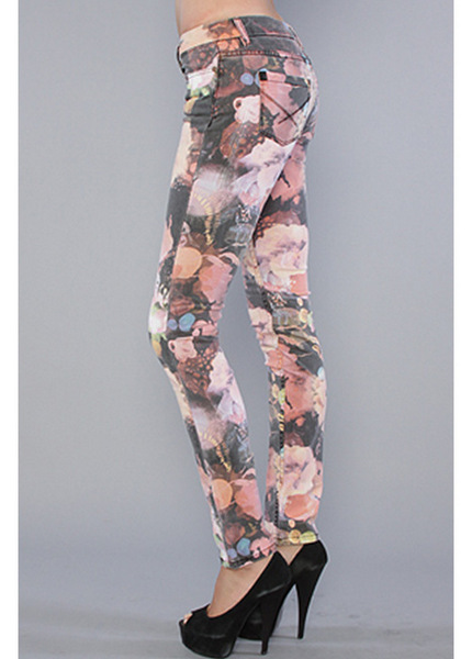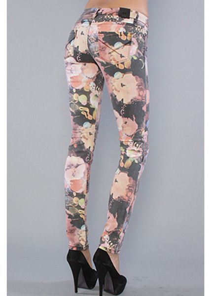 Low rise 5 pocket skinny jeans with silver rivets and allover pattern; zip fly and button closure; 7.5” rise; 30” inseam; 98% cotton, 2% spandex.