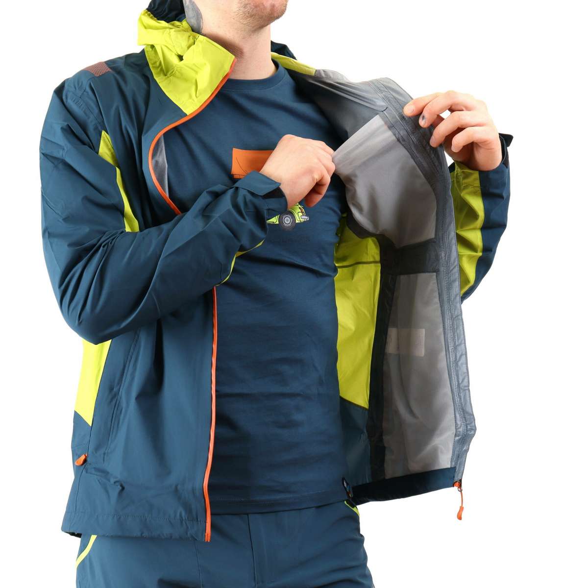Eco-compatible weather protection made of 2,5 layer fabric that also allows optimal breathability. Discover JKT can be stored in the internal chest pocket and easily carried in the backpack for unexpected weather changes.