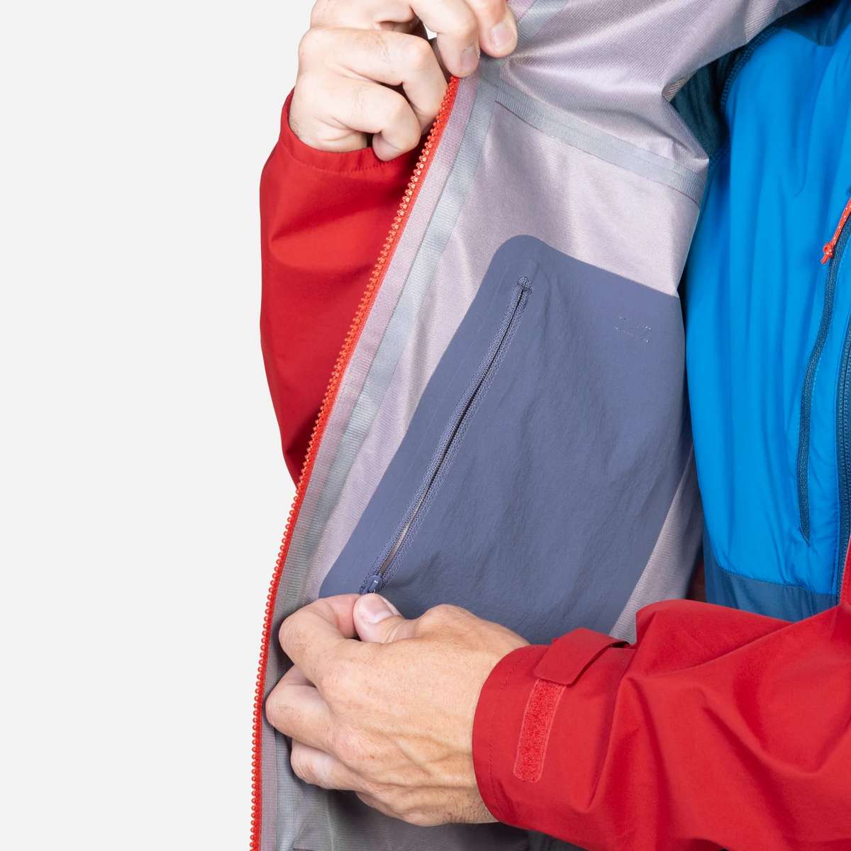 The peaked helmet-compatible hood is roomy and fully adjustable, facilitating a secure fit in the face of strong winds. The Alpine Fit minimises excess fabric, avoiding flapping or bunching without feeling restrictive, and articulated pre-shaped sleeves facilitate dynamic movement, whether coiling ropes, shouldering packs or using axes. Adjustable hem drawcords and laminated cuffs help accommodate layering and seal out driving rain, offering complete protection in very wet weather. At the same time, large pit zips let you regulate temperature and manage moisture buildup during strenuous uphill legs or in humid conditions.