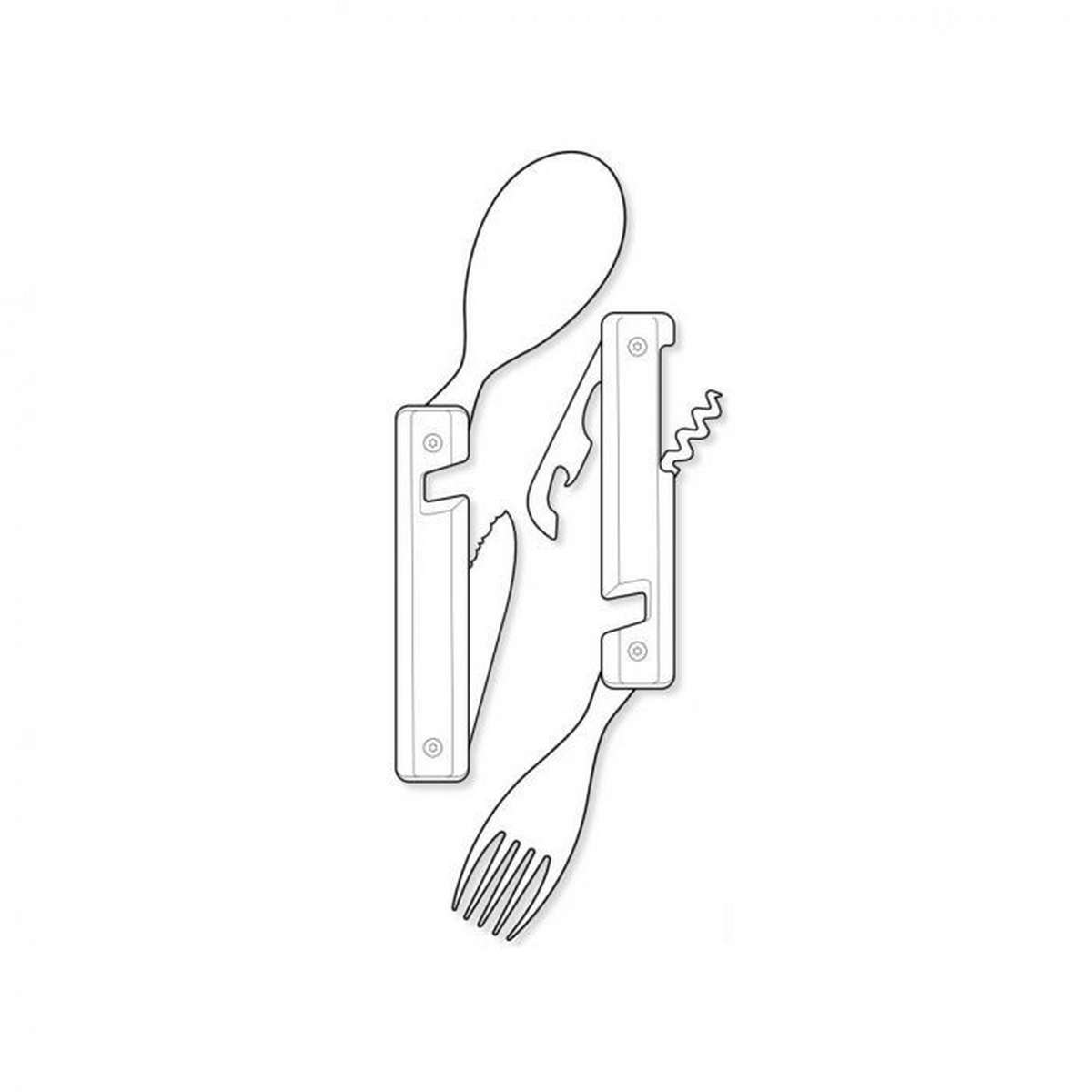 Multifunctional everyday companion: your new 13H25 cutlery set can do anything. This multifunctional folding cutlery features a large spoon, a 5-tooth fork, a knife with a micro-serrated blade... and more! It also features a 4 spiral corkscrew, a can opener and a bottle opener. Easy to fix with built-in magnet. Compact design so you can take the outdoor cutlery anywhere.