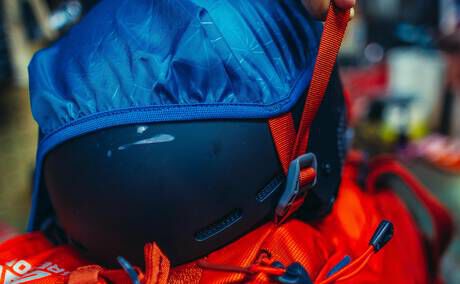 Deployable helmet carry system for long approaches with easy to use hooks.