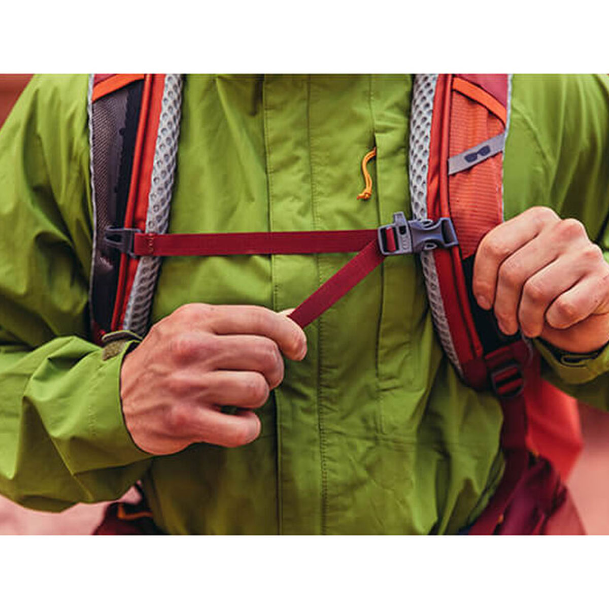 - Front oversized stretch mesh pocket with secure buckle closure