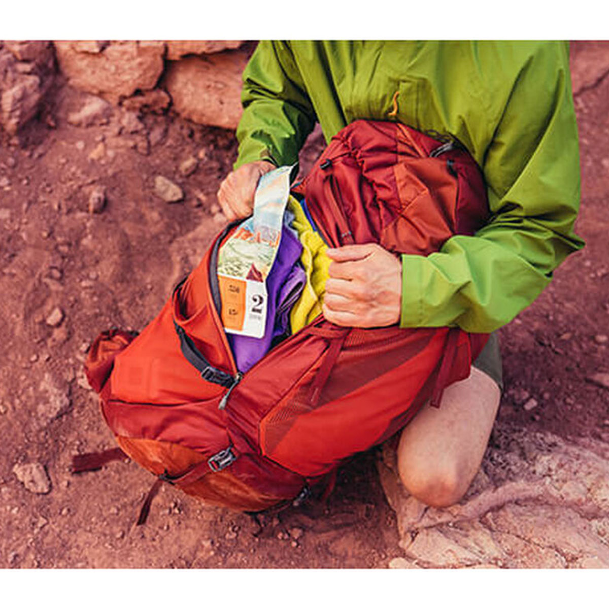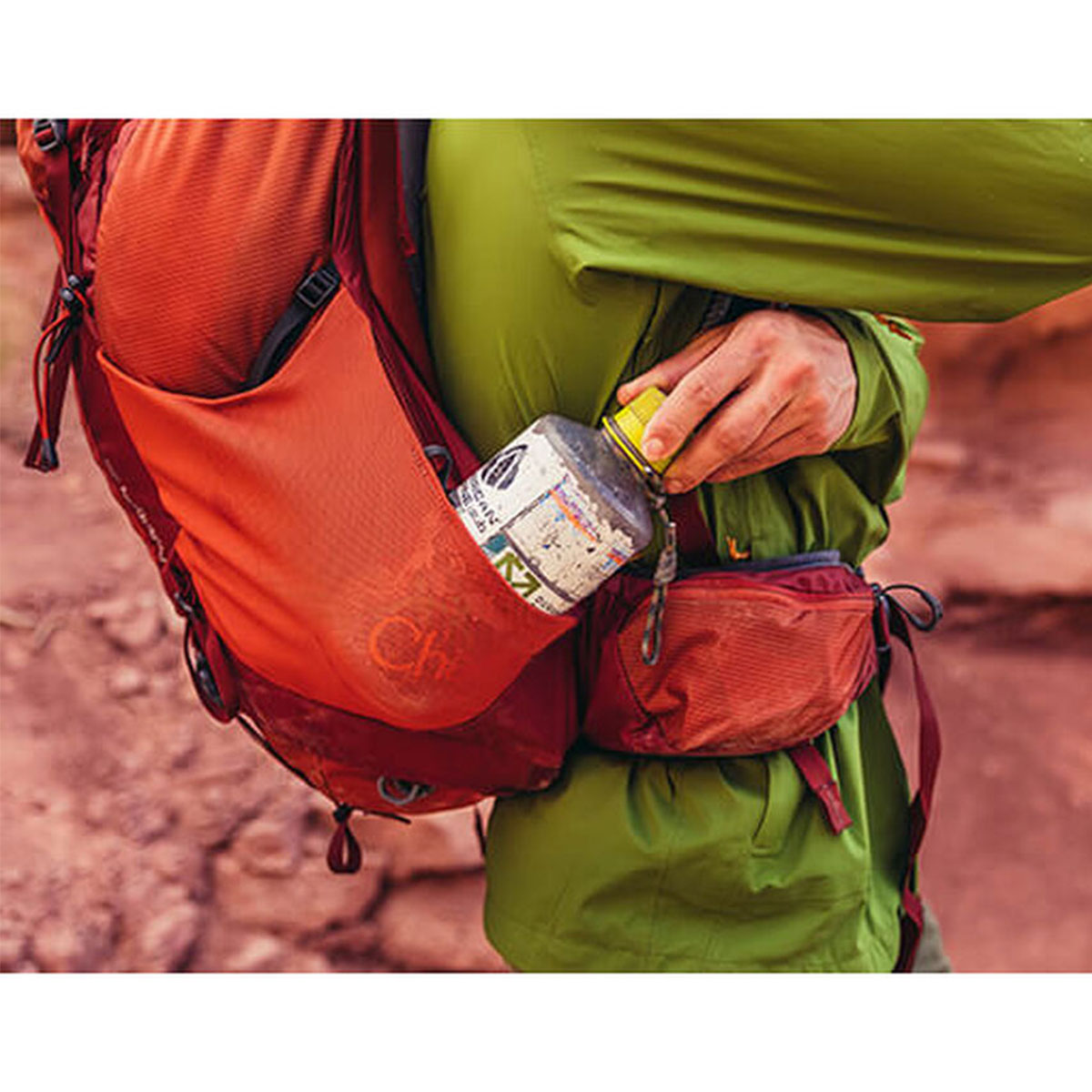 - Dual side stretch mesh pockets, one with side trail access, with pass through for over or under compression