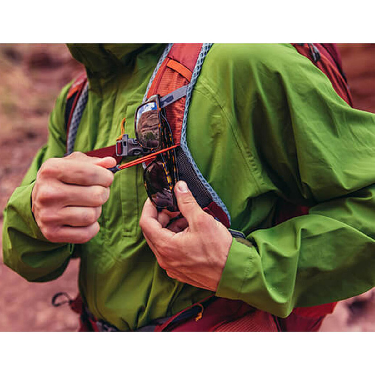 QuickStow system on shoulder harness for a secure, scratch-free way to store your sunglasses.