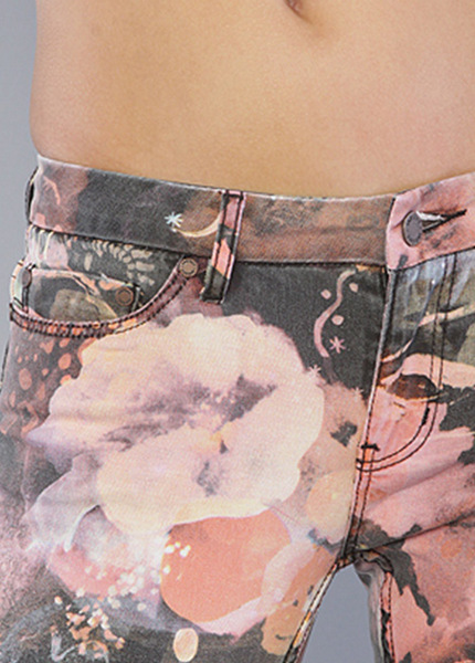 Low rise 5 pocket skinny jeans with silver rivets and allover pattern; zip fly and button closure; 7.5” rise; 30” inseam; 98% cotton, 2% spandex.