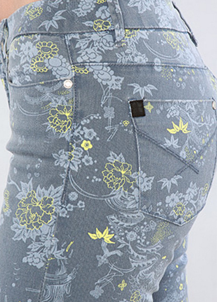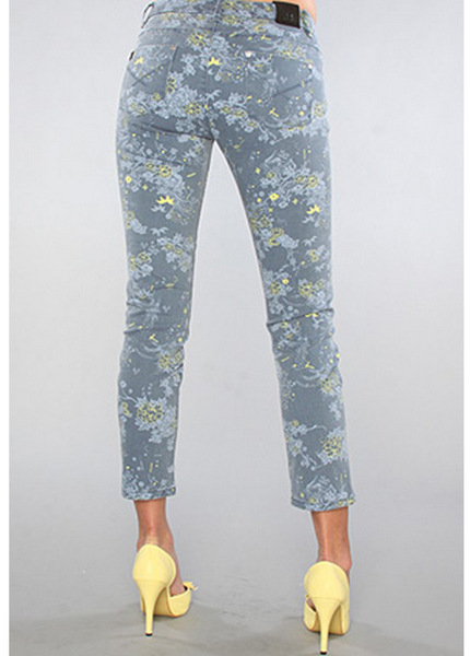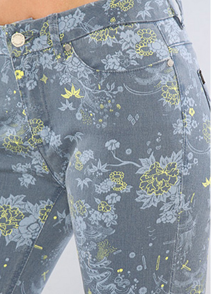 Five-pocket cropped denim skinny jeans with contrast floral print; metal logo rivets; zip fly with button closure; belt loops; contrast stitching; 8.5" rise, 26" inseam; 98% cotton, 2% spandex.